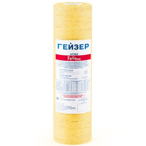 Гейзер Fe mix 20Big Blue применяется для удаления из воды растворенного и окисленного железа, марганца и тяжелых металлов. Картридж изготовлен из катионообменного и полипропиленового шнура и имеет возможность восстановления (регенерации) способом замачивания в 2% растворе уксусной кислоты, после регенерации следует интенсивно промыть картридж чистой водой.
